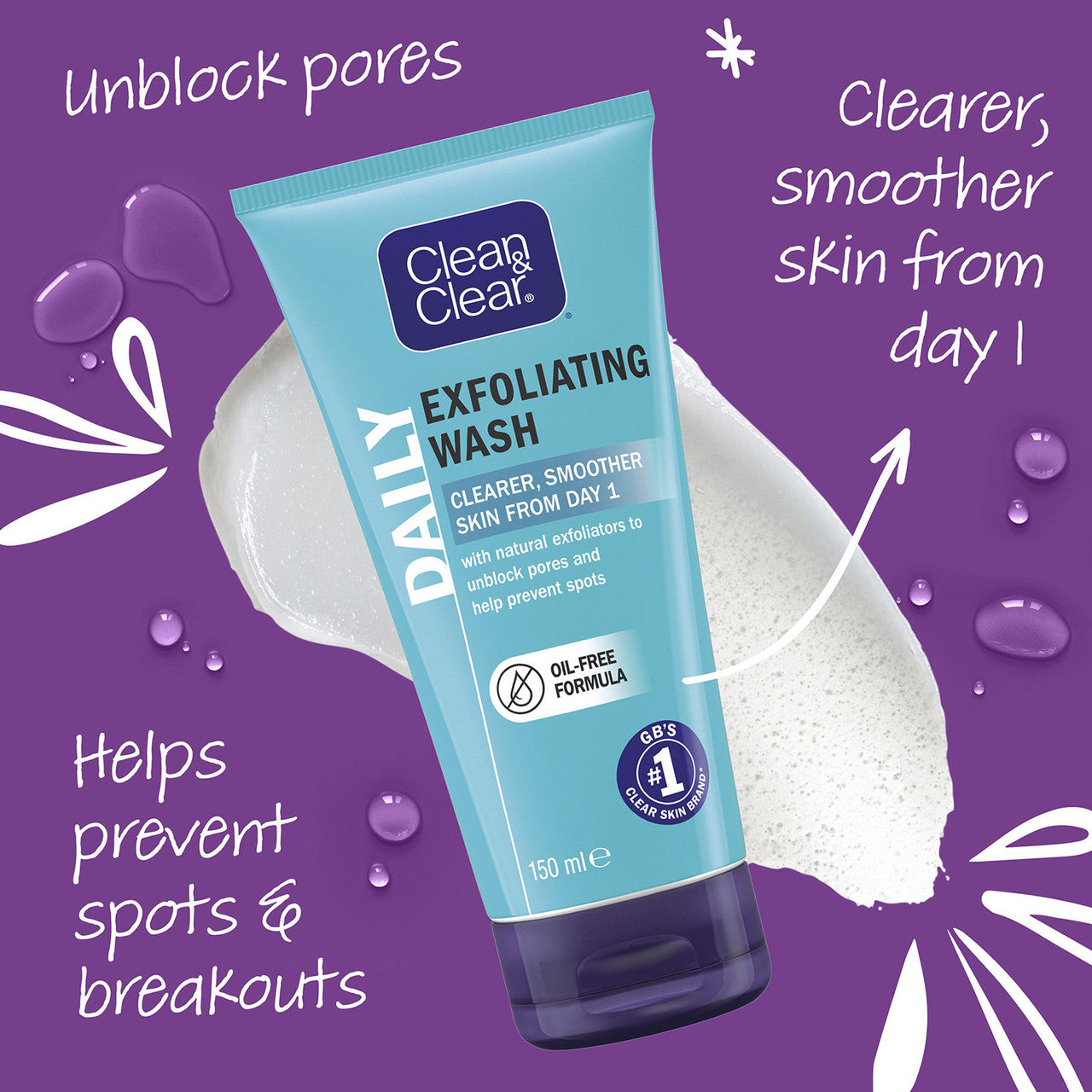 The Clean & Clear Exfoliating Daily Wash is NO.1 Clear skin face wash in GB . It contains natural exfoliators which effectively remove dirt, oil and dead skin cells that can block pores and lead to spots and blackheads. Its gentle exfoliating action will leave your skin beautifully Smooth and clear from day 1. It has oil-fighting formula to prevent spots.